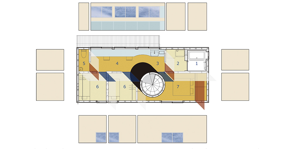 この住宅の本質は地域との関係性などという他律的な要因よりも、南小路側で外部と接しつつも、むしろ独自の論理体系に従って全体が構築されているその自律性にあると言っていいだろう。空間中心には螺旋階段を内包した黒く太いシリンダーが据えられ、室内のどこにいても直接視線の通ることのない「あちら/こちら」が生み出されている。その同時に見ることのできないあちらとこちらの(主に)壁面には「対」となるような関係性を有した形状や造形が配されている。シリンダーを中心に移動する中で、同時には見ることのなかったそれらの要素が、「残像」のようにイメージの連関を次々と示し、実空間に重なるように知覚上の空間次元が生み出されるという論理だろう。