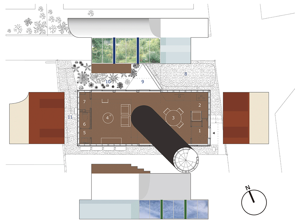 一見して、誰もがポストモダン期のデザインを思い出すだろうが、この若い作家たちは、通常ネガティブに捉えられがちであったポモ作品の良き面を引き継ぐことを積極的に意識している。それは色彩や記号であり、そして一般には理解し難いかもしれない自律的論理への傾倒でもある。自身がクリエイターでもある施主は、「分からないから」この建築家たちに依頼したと述べていたことが印象に残る。