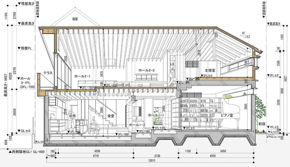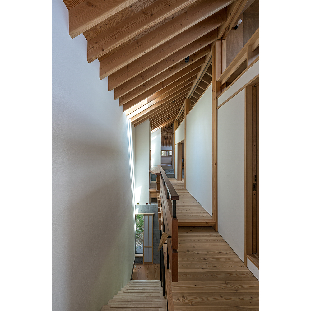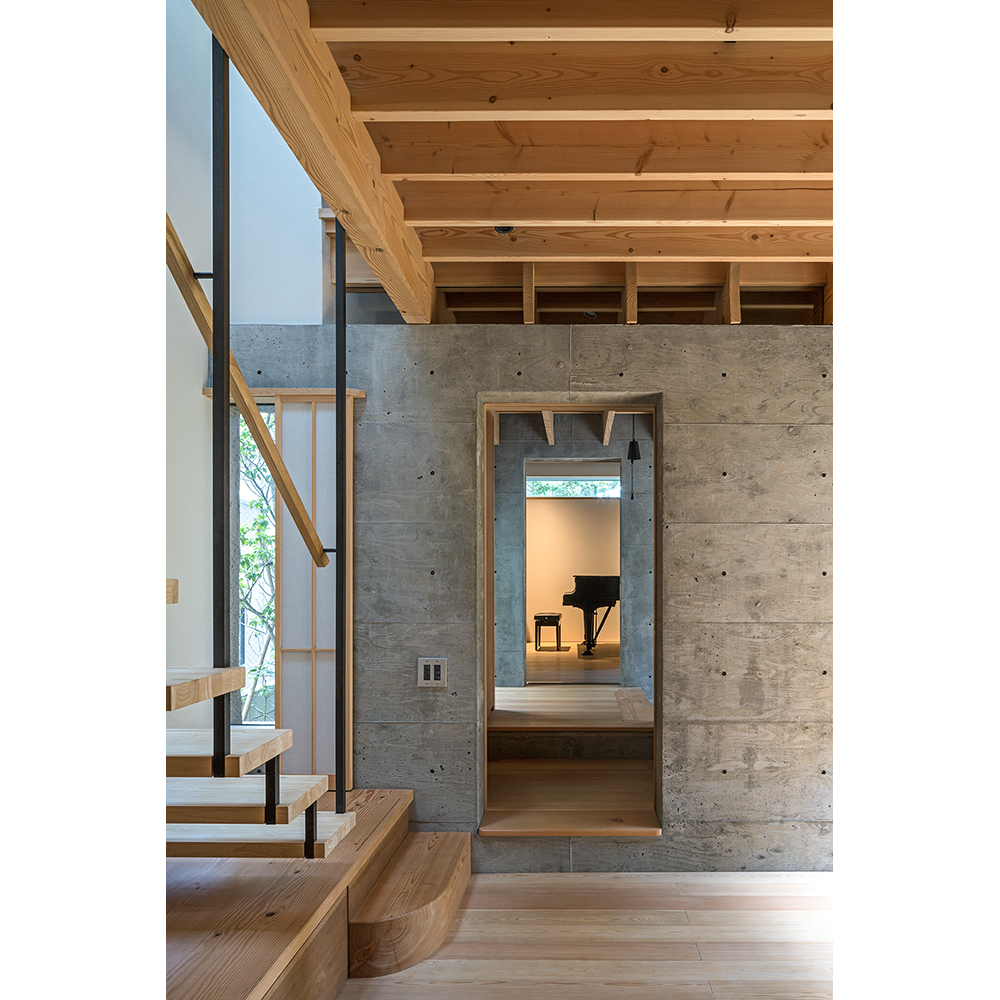 同時に、ピアノ室を囲む閉じた箱と生活の場を挟む開放的な2枚の独立壁はRC躯体とし、それらを基壇に軽い木架構を掛け渡し、上下階を連ねる地形を生み出す。ここでは躯体の上に木梁や根太を掛け、柱を立てるというひとつひとつのつくる過程をそのまま意匠として現した。