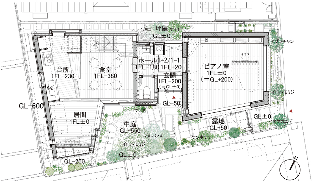 露地から始まる空間は、小さな段差を上がり下がりする玄関と中庭、食堂と中庭、ピアノ室と坪庭へと内外に連続して視線を分岐し、落ち着きをもたらしている。視線は内部だけでなく露地や中庭、坪庭、そして隣家の庭、高窓からの借景、隣棟間の余白へ、街へと広がりを見せている。