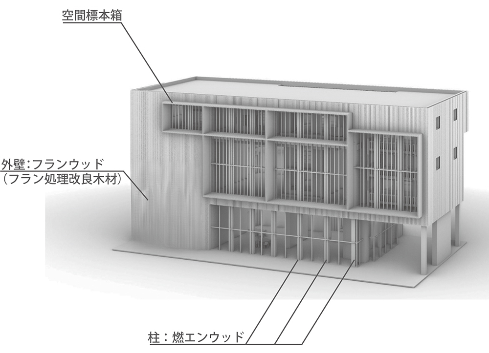 外断熱もURとしては新しい試みである。外装にも木質系素材(フランウッド)を用いることでこれまでの団地住棟とは異なるファサードを実現した。八王子の旧集合住宅歴史館内の復元住戸(6戸)を移築したが、復元住戸を「空間標本」というミューゼオロジーの理念でとらえ直すことで、「標本箱」という中庭側に復元住戸を表出させる特徴的なデザインが可能になった。(渡辺 真理、木下 庸子)