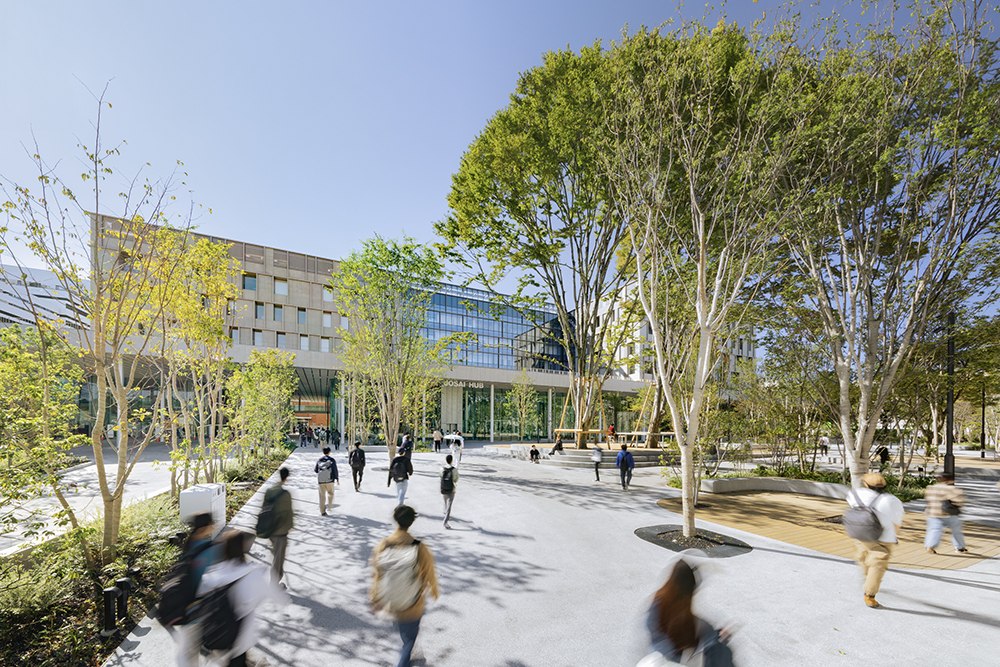23号館(JOSAI HUB)は、広大なキャンパスの正門に面して整備したキャンパスコモンと講義室・研究室・実験室の複合棟である。講義室の建て替え要望から始まったこのプロジェクトは、キャンパスの東西で分かれていた文系と理系をつなぎ、約60年間継承されてきた豊かな緑と学生の賑わいでキャンパスの顔をつくるという、1棟の建物でキャンパスのマスタープランを改善する挑戦にまで発展した。「JOSAI HUB」はこのキャンパスに通うすべての学生のための活動と交流の拠点である。地上階に設けた大きな庇の下のひとつながりの空間で、学生は正門から「JOSAI HUB」を通り抜けて各棟へアクセスする。動線上にさまざまな居場所をぶらさげ、ラーニング、セルフスタディなどの学習スペースや、カフェ、ラウンジ、事務窓口などを約3,700㎡の空間に仕切りなく配置した。用途を限定しないことで重ね使いによるスペースの有効活用と活動間の相互作用を促進する。屋内・屋外の垣根を超えて大小さまざまな居場所をゆるやかにつなげることで、活動の領域が重なり、キャンパス全体に拡がっていく。