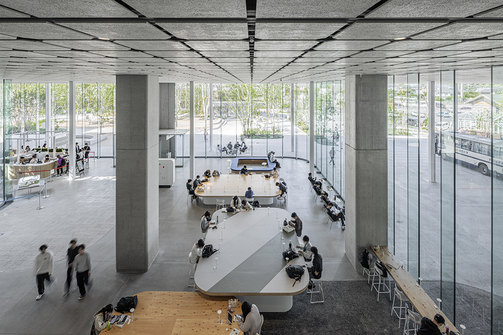 - 大庇の下のひとつながりの空間「JOSAI HUB」。ラウンジより東方向を見る。