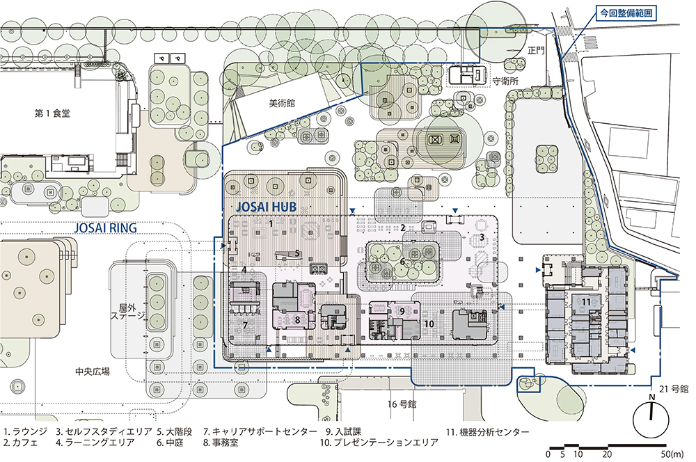 今後、隣接して設ける広場およびそれを囲う開放廊下「JOSAI RING」と連結されれば、キャンパス全体の格子状配置が同心円的連環構造に転換され、計画者の意図通りにここがキャンパスの交差点HUBとなり、キャンパス全体の更なる活力向上が期待される。(北 典夫)