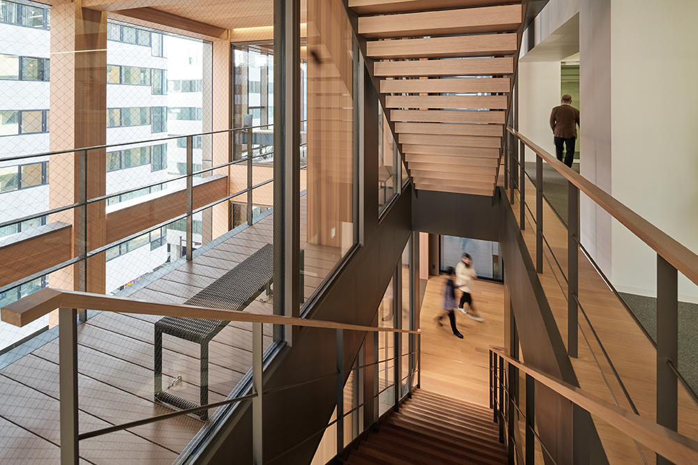 木造エリアは、長期荷重のみを負担する自由度の高いオープン架構とした。開放的な階段でフロアを結び部門間の交流を活性化すると共に、高透過ガラス越しに木架構を表出し、街に開き企業活動や理念を広く発信することを企図した。