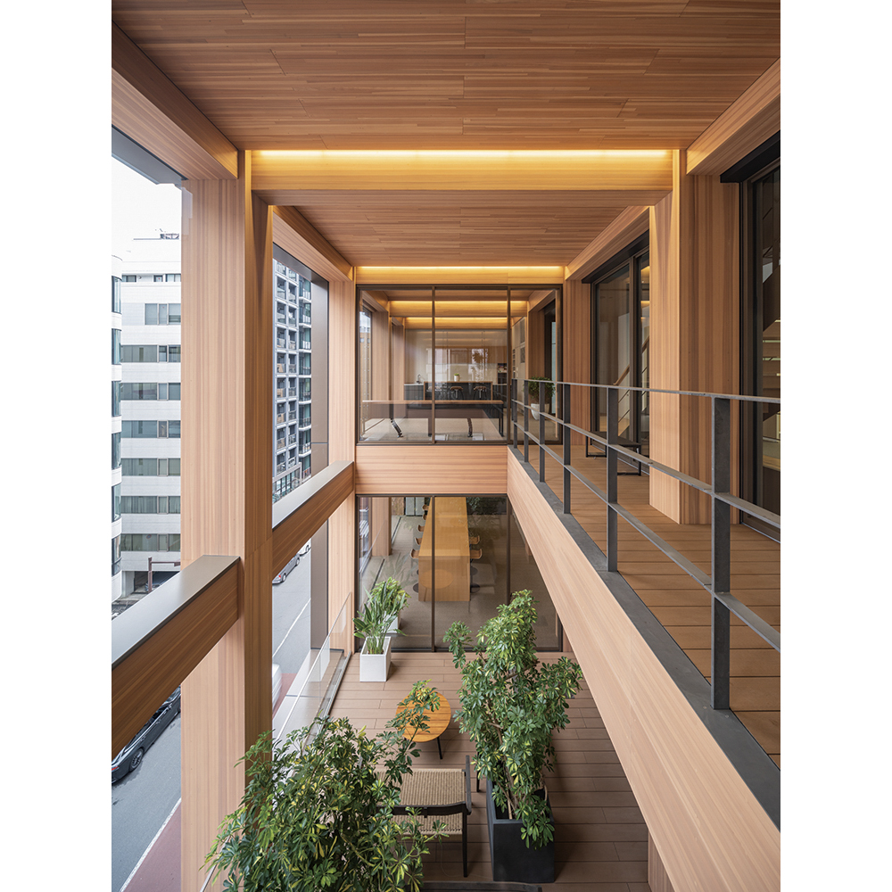 大正12(1923)年に発生した関東大震災直後に、復興建築資材として合板供給のため起業した本社ビルであり、創業100周年を機に、創業の地で本社ビルを建設する記念プロジェクトである。新橋発祥の老舗企業の願いとして、環境に配慮した持続可能社会と良質な都市環境形成に貢献する建築の在り方が求められ、まちなみと一体感のある木架構の佇まいを構想し、純木質耐火集成材「FRウッド」を多層型建築の主要構造部に初めて適用した。