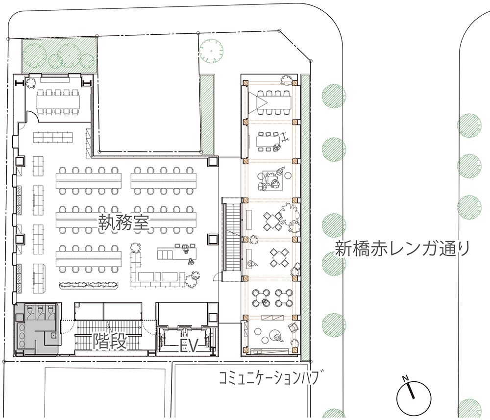 - 新橋赤レンガ通りに面する東側外観。都市に木架構を表出する外装デザイン。*