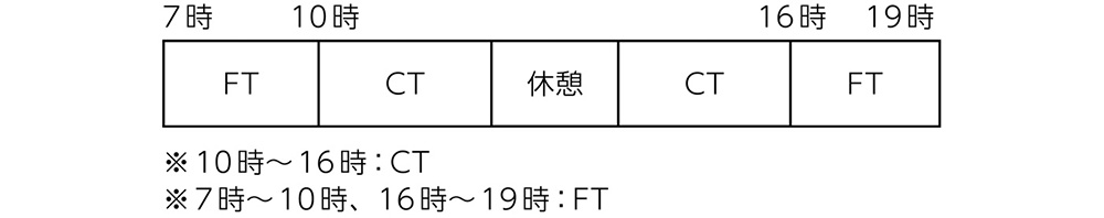 ここでCTとは労働者全員が労働しなければならない時間帯をいい、FTとは労働者がその選択により労働することができる時間帯をいます。図解に示すと以下のようになります。