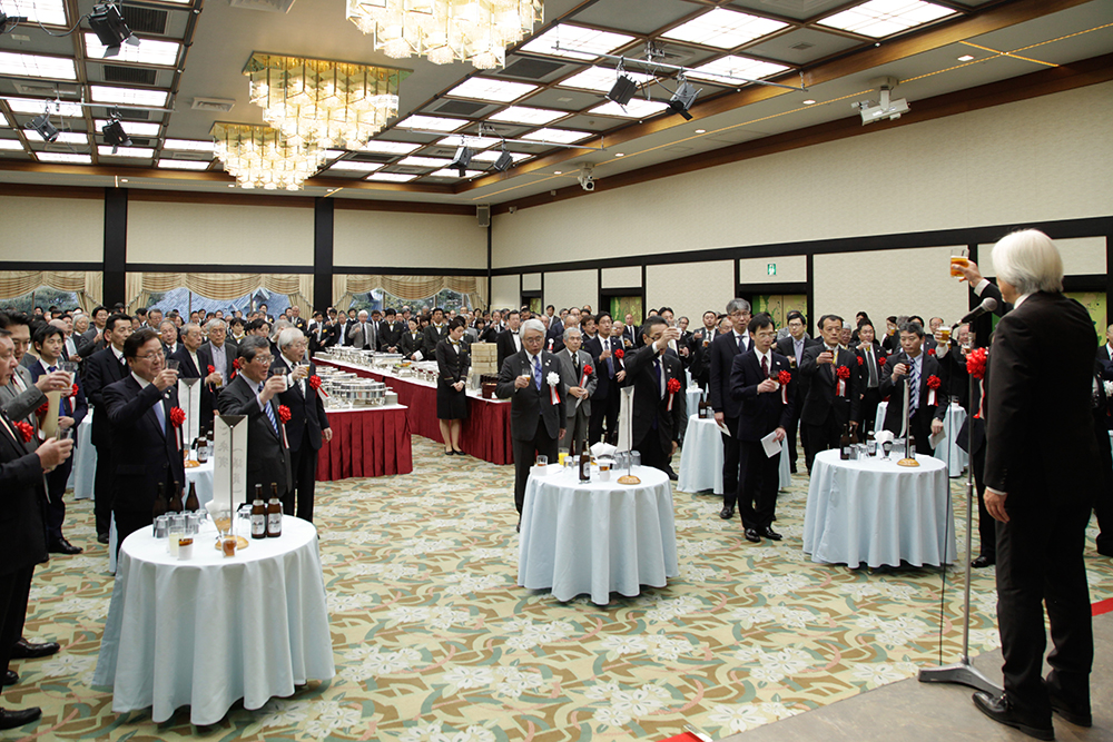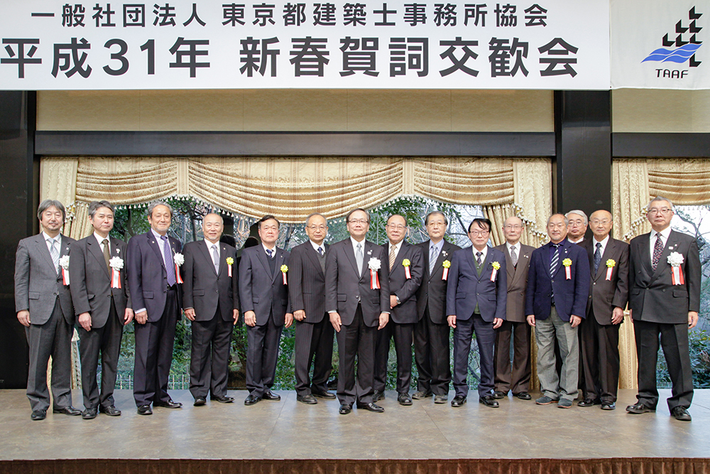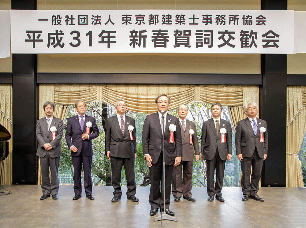 平成31年(2019年)1月30日、恒例の新春賀詞交歓会が、東京・明治神宮外苑に佇む明治記念館「蓬莱の間」にて開催された。すがすがしい冬晴れの日、夕刻4時に始まったイベントは、来賓66名を含め、正会員・賛助会員合わせて273名が出席する盛会となった。