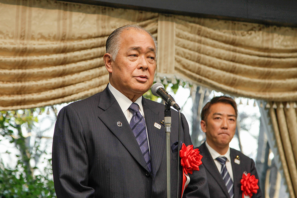 挨拶する児玉会長と背後に副会長。