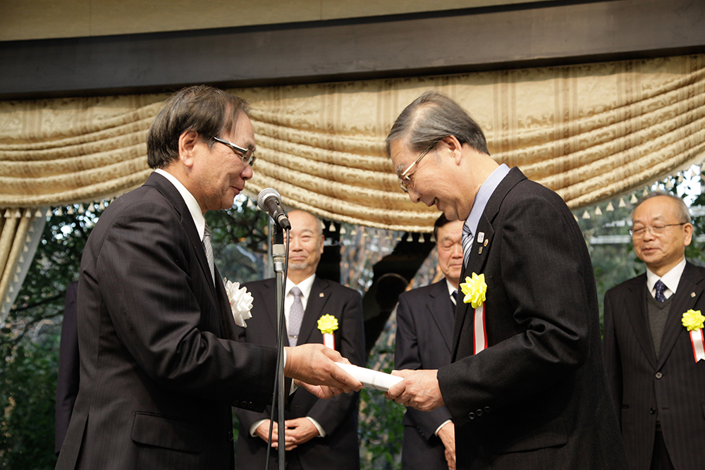 古希者代表として織本真一郎さんへ児玉会長から記念品贈呈。